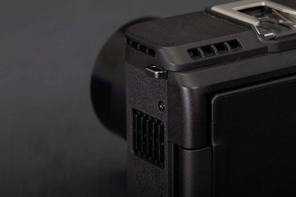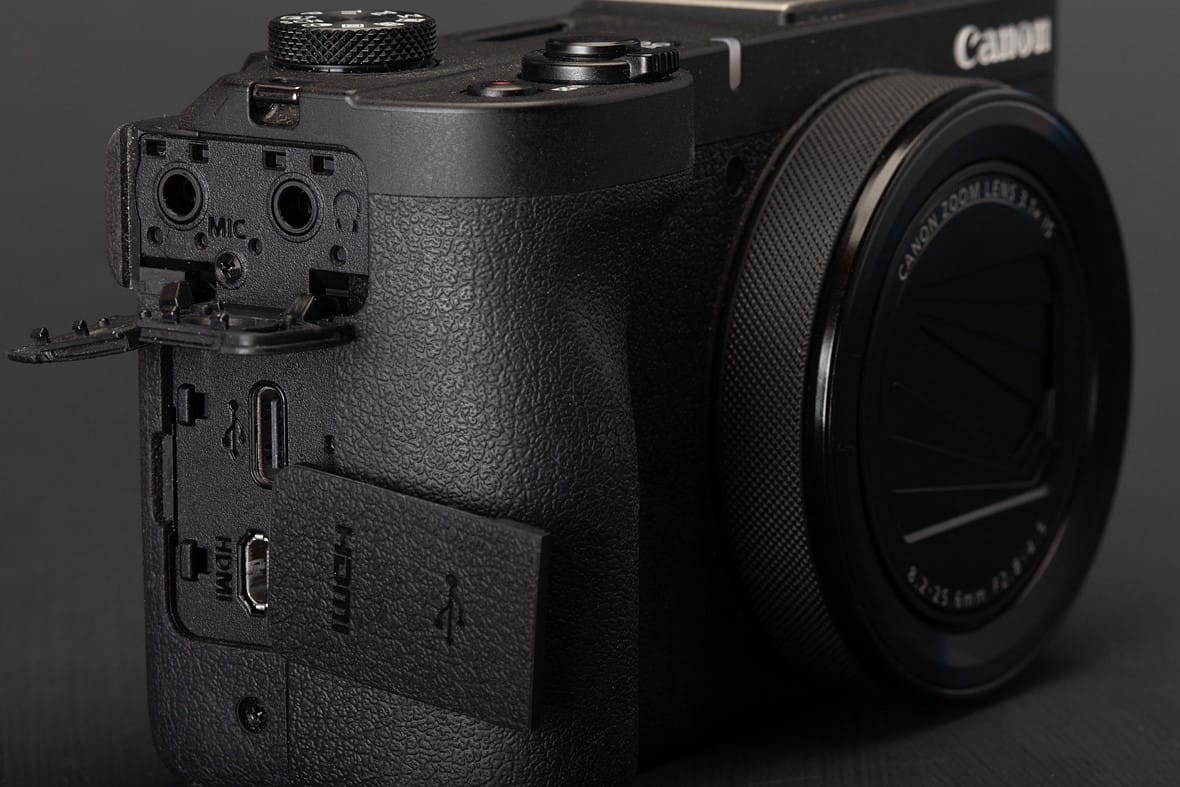 PowerShot V1 có cả ổ cắm Micro và Tai nghe, được đặt ở bên sườn phải, nghĩa là chúng không thể va chạm với màn hình xoay lật được gắn ở phía bên kia của máy ảnh. Bên dưới là cổng USB-C và Micro HDMI.