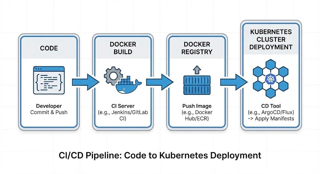 - Run/Orchestrate (Kubernetes): K8s sẽ lấy Image từ kho lưu trữ đó và triển khai lên các server (Node). Toàn bộ quá trình này thường được tự động hóa qua CI/CD (Jenkins, GitHub Actions).