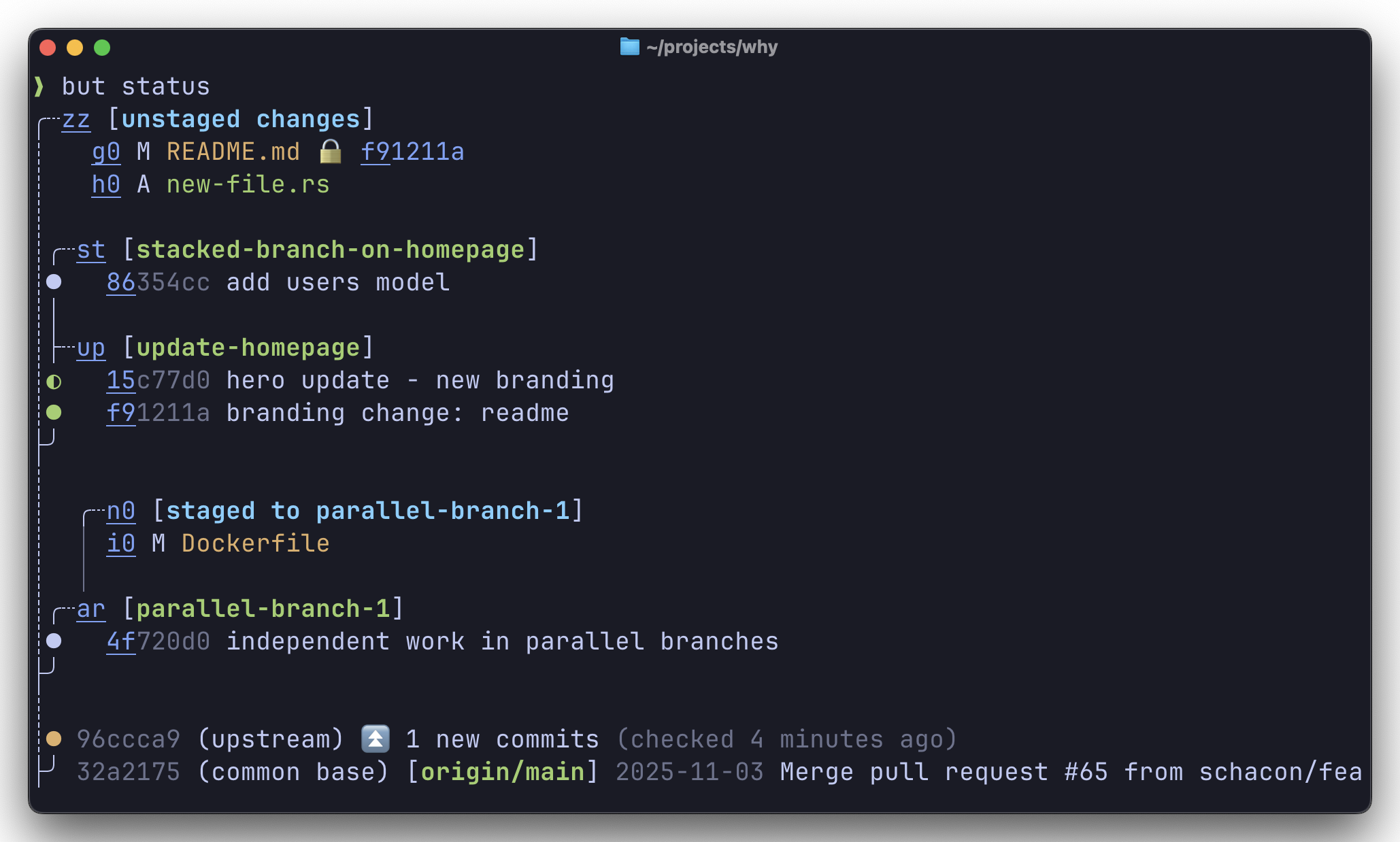 GitButler đi kèm với một công cụ CLI mạnh mẽ tên là but. Ví dụ, để xem trạng thái các nhánh ảo: