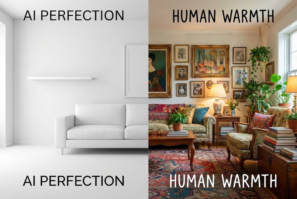 Hãy nhìn vào thực tế: AI hiện tại (với Midjourney v7 hay DALL-E 4) có thể tạo ra những bức ảnh và layout Minimalist hoàn hảo không tì vết. Một căn phòng trắng tinh khôi? Một giao diện app sạch sẽ? AI làm tốt hơn con người.