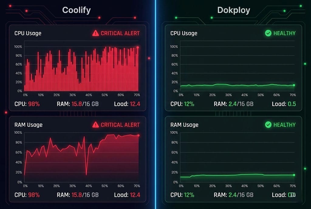 - Coolify: Daemon của Coolify ngốn khá nhiều RAM (thường chiếm 500MB - 1GB chỉ cho việc quản lý). Giao diện đôi khi có độ trễ (lag), đặc biệt khi load danh sách deployment dài.