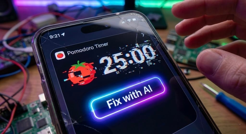 Vấn đề định vị cũng khá đau đầu. Một widget thời tiết lẽ ra phải lấy vị trí thực tế của mình thì lại hiển thị dự báo cho... 4 địa điểm ở London mà mình đã lỡ dùng làm ví dụ trước đó. Tệ hơn nữa là cái đồng hồ Pomodoro: nó ngừng đếm ngược ngay khi mình khóa màn hình điện thoại. Điều này hoàn toàn vô nghĩa đối với một ứng dụng cần chạy ngầm để nhắc nhở. Ngay cả một widget ảnh đơn giản để lấy hình từ thư viện cũng không hoạt động, và nút "Sửa bằng AI" của Builder cũng chẳng giúp ích được gì.