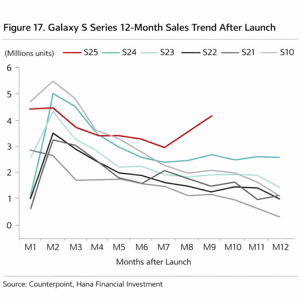 "BREAKING! Something unusual is happening with the Galaxy S25 series. Do you see that red line? Around the 8th and 9th month after launch, sales go up instead of continuing to fall. That’s not normal." — Ice Universe